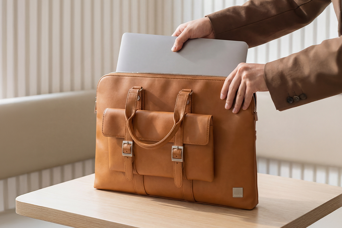 A refined, classic silhouette updated with practical features for contemporary work life. Lightweight vegan leather protects your devices while elevating your everyday professional look.
