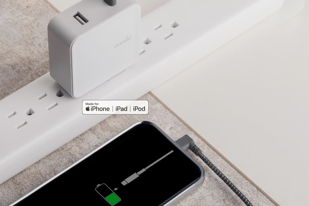這款超耐用傳輸線以90度彎角接頭設計為特色,減少 Lightning 接頭的拉力負擔,讓充電更為便利順暢。適合放在車內置杯架時為裝置充電,或邊玩手遊時邊充電使用。